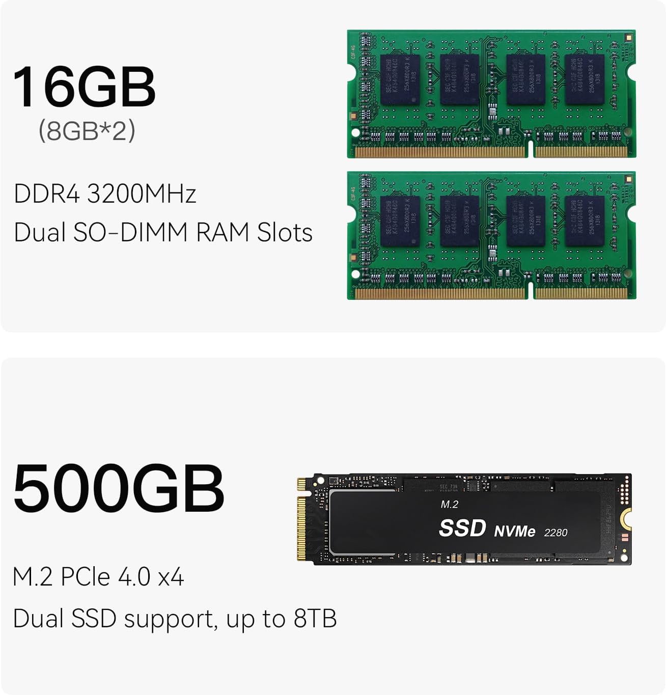 【High capacity & Expansion Options】Beelink mini pc built-in 32GB 3200GHz DDR4 RAM(supports up to 64GB dual channels, not included) and 500GB M.2 PCle4.0 SSD,expandable up to 8TB (2x 4TB,not included). You can quickly launch and load applications,with ample storage space for files,pictures,videos,games,and more.